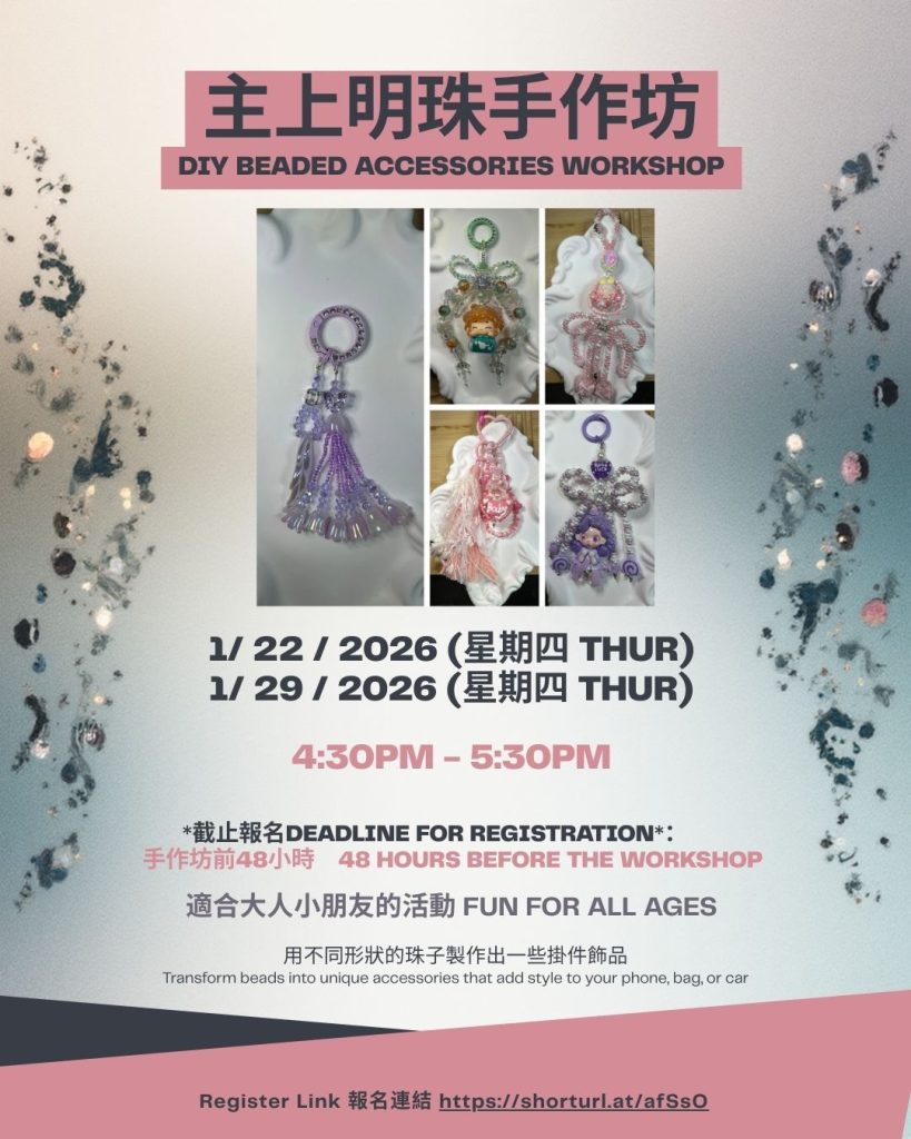 內容: 會用不同形狀的珠子製作出一些掛件飾品,可用於手機、手袋、或掛車飾物。適合大人小朋友的活動。Transform beads of every shape into personalized accessories that brighten your phone, bag, or car. Fun for the whole family—kids and adults alike.