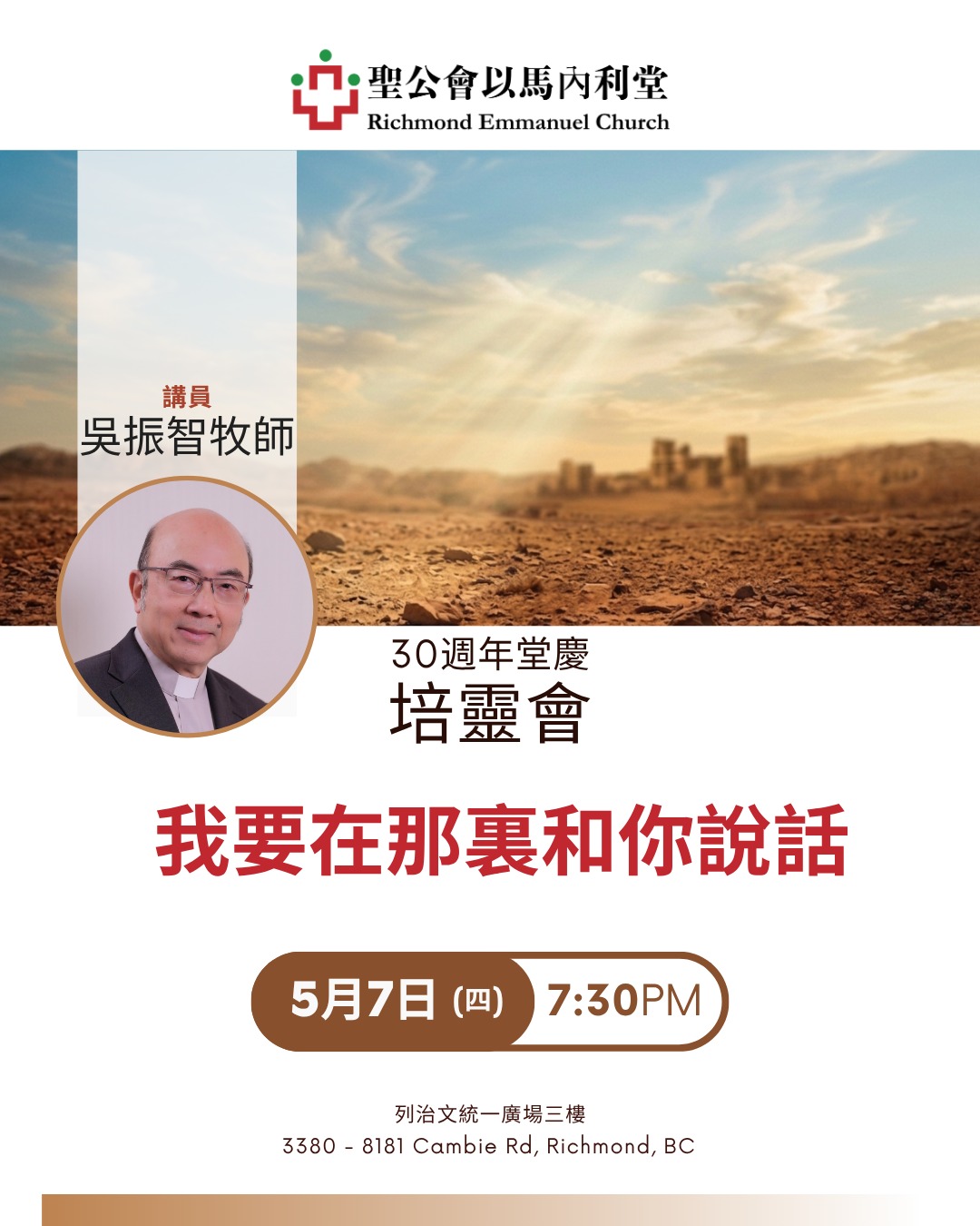 30週年堂慶培靈會 — 我要在那裏和你說話 Date: 7 May (Thu) Time: 7:30pm Location: Richmond Emmanuel Church #3380, 8181 Cambie Road,#3380, Richmond Rev. Paul Ng Cantonese, Promotion